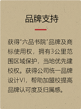 4、按照总部要求统一品牌名称与形象。认同六品书院教学理念,热爱教育事业,认同并维护“六品书院”品牌。